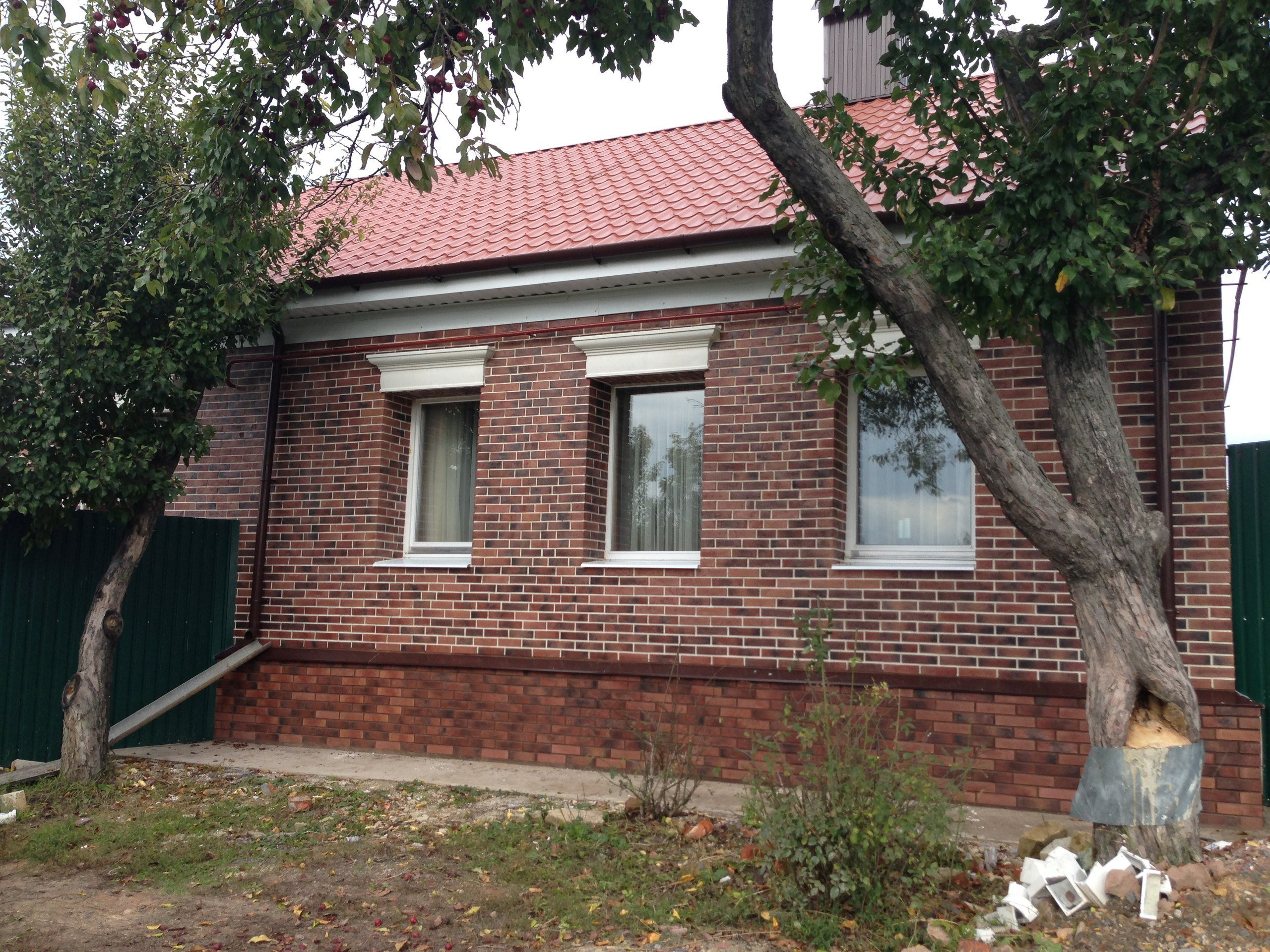 Обратите внимание на то что декоративный кирпич на фасаде дома и на цоколе один и тот же, разный только цвет затирки. На фасаде дома цвет затирки светло-бежевый, на цоколе дома цвет затирки темно-коричневый.